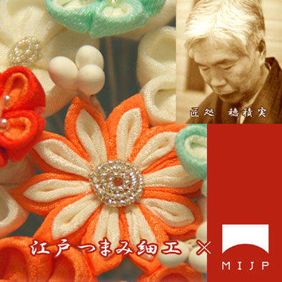 | つまみ細工は、絹の羽二重やちりめんの小さな色布をピンセットでつまみ、小花などを形づくる伝統的な技法。 一般的には『七五三の髪飾り』に多くその技法が使用されています。 また、『歌舞伎の髪飾り』や『舞妓さんの髪飾り』には、無くてはならない技術とされています。 |