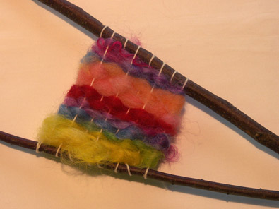輪切りにした木に貝がら・木の実などを自由に飾りつけてローソク立てをつくります。 (2)小枝のはた織り Y字型の木の枝に横糸をはったものにカラー羊毛を通し織りあげて飾りをつくります。 |