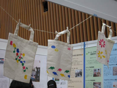 | 好きな色・好きな形を選んだら、用意してあるバッグにステンシルをしよう!色んな形をステンシルして、自分だけのオリジナルバッグが作れるよ!! |