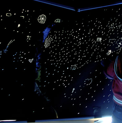 | 黒い紙に画鋲で穴を開けて絵を描きます。 穴の絵を太陽にかざすと、光の絵になります。 光の絵を集めて、星空の空間をつくります。 |
