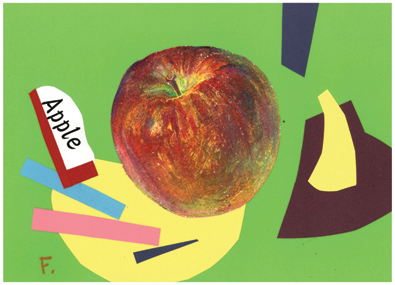 | さわって、においをかいで、食べてみて・・・。自分の感じた「リンゴ」を描いてみよう!「ぐるぐる画」といういつもと違う描き方で、まずは中身を描いてみます。それから皮の色を塗り重ね、こすったりけずったりしてどんどん自分だけのリンゴにしていきます。だれでも楽しく描けます |