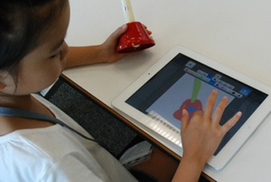 | みなさんには、こちらでご用意したiPad2を使って体験していただきます。まずはじめに、簡単な操作説明を交えながらみんなで一つ楽器を作ってみます。使い方が分かってしまえば、あとは自由時間♪部屋の中を自由に使って、かわいい絵を描いたりおもしろい音を作ったりして、オリジナル楽器作りを楽しもう! |
