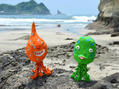 | あなただけのかわいいタコを作りませんか?新聞紙をぐちゃっと丸めて頭をつくり、8本足(用意してあります)をボンドでくっつけます。絵の具(アクリルガッシュ)で色を塗り、楽しい顔をかいてください。乾かして持って帰っていただけます。 |