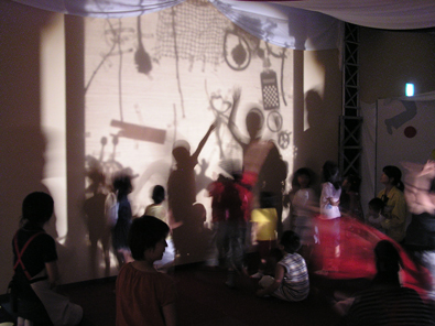 | 透明の大きな板にいろんなものをペタペタ貼り付けて、光をあてて壁に大きく映してみると…見たことのない幻想的な世界が広がります。みんなで作った「かげの世界」の中にキミも探検しにいこう! |