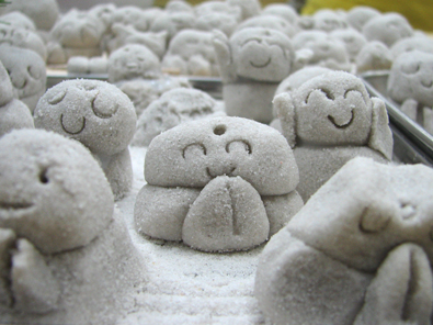 | 震災からもうすぐ一年。被災地のことを忘れないために、被災地の今を展示・報告するとともに、復興への支援の気持ちを込めて、参加者の皆さんと千体を目標に、白砂のミニ地蔵を会場で作ります。参加者の皆様からお支払いただいた「参加義援金」は、材料費を引いた残りの金額全てが被災地への義援金となります。 |