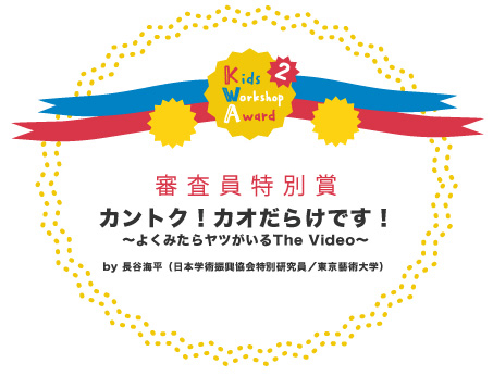 | 子どもにとっても大人とっても映像はとても身近な存在です。でも、映像制作は親しみやすさから感じるほど楽ではありません。そんなギャップを越えて、大人にも子どもにも実写を扱った映像制作の面白さが伝わるワークショップとして完成できて良かったなと思います。今回うまくいったのはCANVASの皆さんによる大きな場づくりと、”カントク!カオだらけです!”を手伝ってくれたスタッフ全員による参加者にとって居心地よい空間づくりのおかげです。特に下口氏には企画段階からお世話になりました。このワークショップはひとりではうまくいきませんでしたよ。 審査員特別賞ありがとうございました。 |