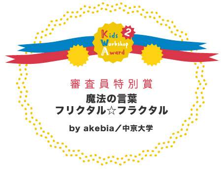 | 審査員特別賞ありがとうございました!akebiaとしてこのイベントに参加するのは2度目でした。以前から私達は、「ワークショップを体験してきた子ども達1人1人の異なる感動を共有する場」を提案してき ました。今回は子どもの現在の率直な気持ちを表現する方法として「フラクタル の木」を用いることで、 自分や他の子どもの木に興味を持ち、違いを楽しんでくれていました。そのよう な活動を評価していただ き嬉しく思います。 |