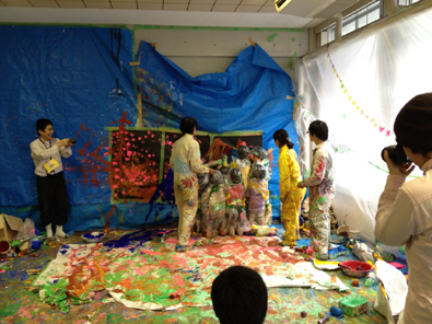| 音楽に合わせて絵を描くパフォーマンス、ライブアート。今回は、流れる音楽に合わせて、自由に楽しく、短時間で絵を描いていきます。みんなで代わる代わる描いて、どんどん絵を完成させていきます。からだ全体を動かして描くことの楽しさを体験してもらいます。 |