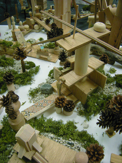 | 家具やおもちゃになりそこねた同じ形ではない木片を使って、世界に一つだけの自分のエコタワーをつくり、そのあとに、お友達のタワーとつなげて、世界にひとつだけのゆめの街をつくっていこう。 |