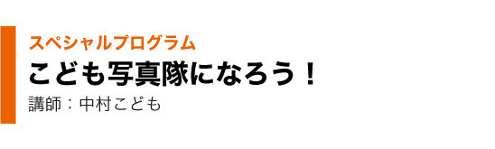 プロ仕様の一眼レフでイベントを記録する「しごと」をしてみませんか。はじめてでも基礎からしっかりと教えてもらえるから大丈夫。君だけの写真を撮ろう。今までもたくさんのこどもたちが一日ですごい写真を撮れるようになってるよ!プログラム前半はデジタル一眼レフカメラの使い方や、写真の考え方を学ぶワークショップを実施、後半は会場で記録写真を撮るお仕事に挑戦だ。プロ仕様の一眼レフでイベントを記録する 「しごと」をしてみませんか? はじめてでも基礎からしっかりと教えてもらえるから大丈夫です。君だ けの写真を撮ろう!