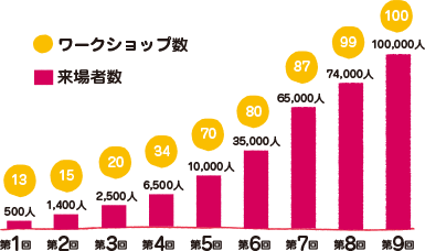 ワークショップコレクションは“世界初”のこども向けワークショップに特化した博覧会イベントとして、2004年にスタートしました。2013年3月の第9回イベントでは、2日間で約10万人の来場者を数え、国内外より「世界最大のこども創作イベント」と評されています。造形、絵画、サイエンス、映像、環境、デジタル、音楽、さまざまなジャンルにわたり約100種もの多彩なプログラムが同時進行的に展開されます。近年では海外ワークショップの参加や海外展開の要望を多数いただくなど、ワールドワイドな展開も視野に入れ、さらなる成長を遂げようとしています。