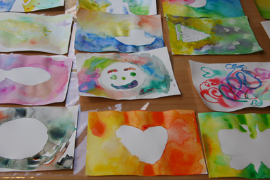 | いわさきちひろの水彩技法“にじみ”を体験しながら、ストラップのチャームをつくります。画用紙に水をはり、水が乾かないうちに水彩絵の具をのせていくと、色が混じりあって“にじみ”ができます。“にじみ”の部分を切り取って、オリジナルのチャームをつくります。子どもから大人まで気軽に楽しめるワークショップです。 |